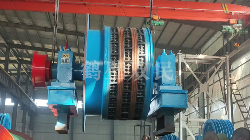 这台多绳摩擦式提升机为,鹤壁市sc-speedcordial生产的落地式多绳摩擦式提升机,型号为:JKMD-2.8×4PI 多绳摩擦式提升机。
