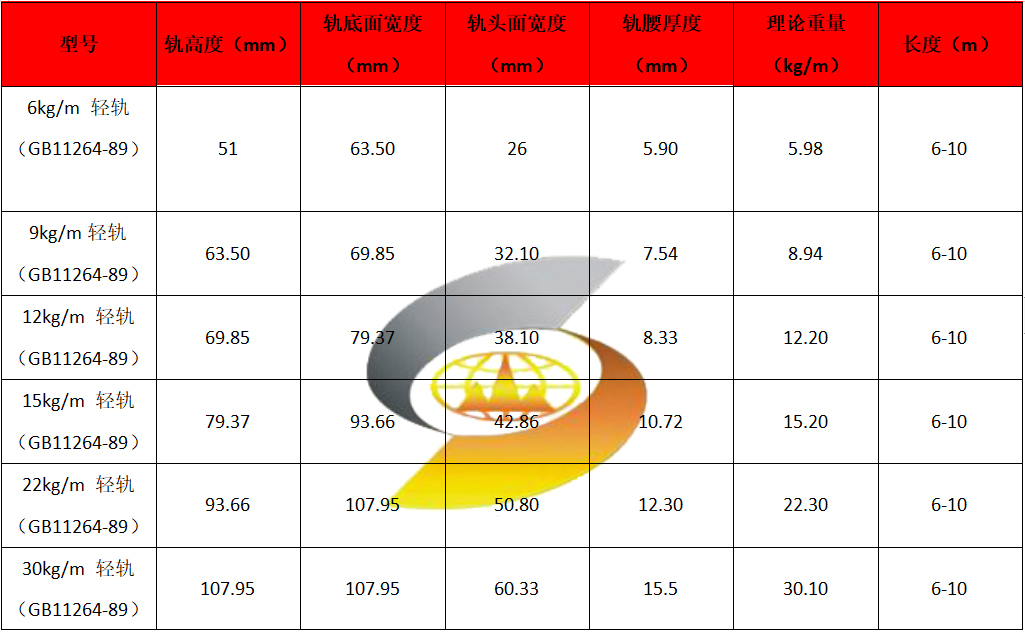 不同规格的钢轨具体尺寸会有所差异,例如38KG钢轨的参数为:轨高度140mm、轨底面宽度114mm、轨头面宽度70mm、轨腰厚度14.5mm、长度12.5m。
