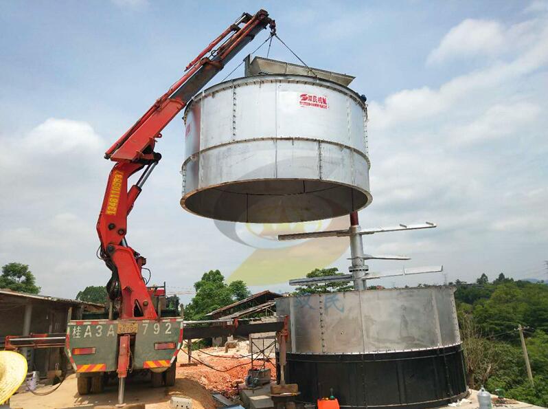 发酵罐主要由发酵室、液压动力系统、主轴传动系统、上料提升系统、自动高压松风系统、出料系统、除理臭味系统和自动控制系统组成,工作时,先由上料提升系统将物料送到发酵室,开启液压动力系统,主轴开始转动,实现物料搅拌,同时,开启送风系统和辅助加热系统,维持微生物发酵条件。等物料在微生物菌剂的作用下腐熟、降解稳定后,通过液压动力系统开启落料阀门,利用皮带输送机将发酵后的物料,发酵后排出的气体通过系统收集处理达标后排除。