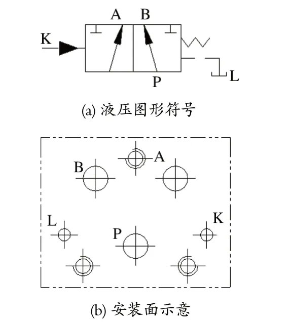 液动换向阀是利用控制油路的压力油在阀芯端部所产生的液压力来推动阀芯移动,从而改变阀芯位置的换向阀。提升机双泵液压站上常用的国产 23Y 型板式液动换向阀如图2 所示。其安装面上有 2 个进 (出)油口 B 和 A、1 个出 (进) 油口 P、1 个控制油口 K,以及 1 个泄油口 L。在双泵液压站中,液动换向阀在泵装置切换时使用,工作泵装置连接 A 口,备用泵装置连接 B 口。工作泵装置运行时,阀芯在弹簧力的作用下被推向左侧,压力油经 A → P 流向液压阀组供油孔;当工作泵装置故障时,电控系统控制工作泵的电动机断电,备用泵的电动机通电,阀芯在控制油 K 的作用下被推向右侧,压力油经 B → P 流向液压阀组供油孔;至此,完成备用泵装置的切换。