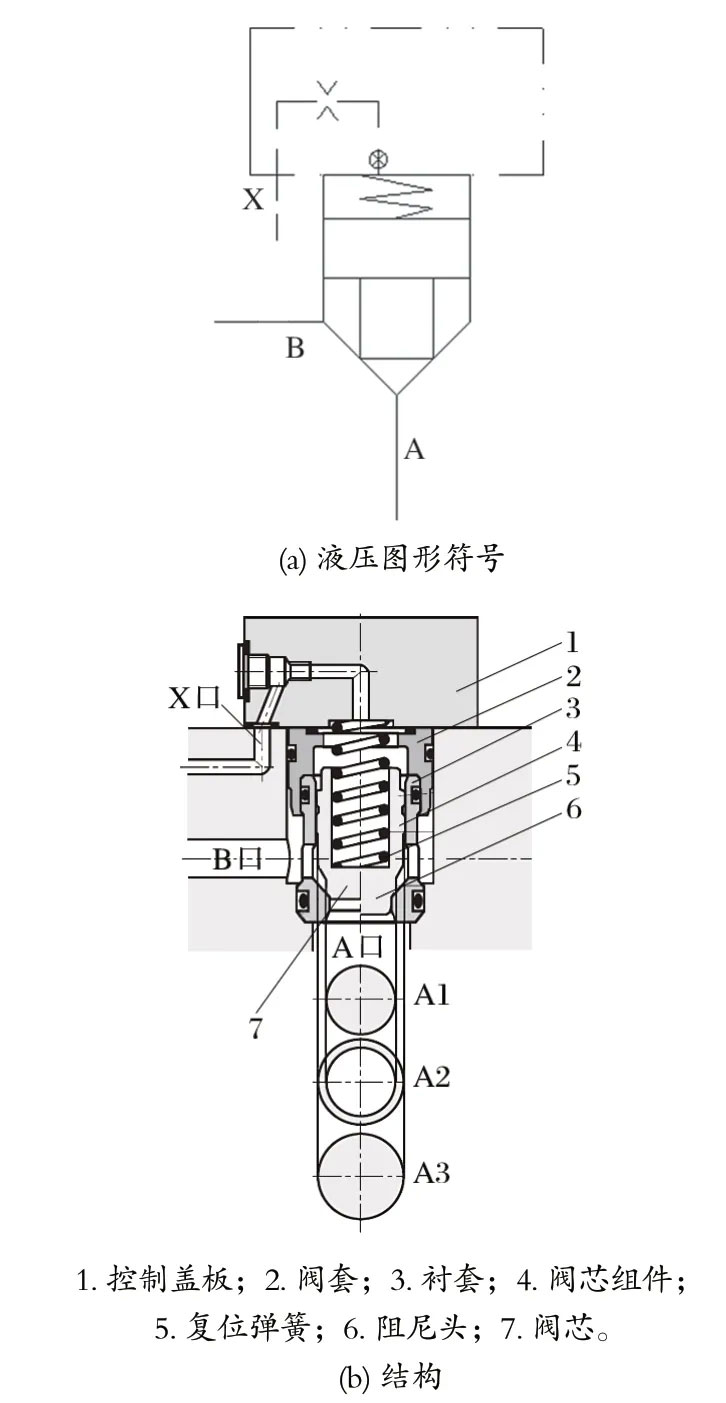 3.1 二通插装阀 二通插装阀由插装组件、控制盖板等组成。插装组件安装于油路块中符合 ISO 7368 的标准安装孔中,并用控制盖板封严。通过插装组件,控制盖板和其他附件的组合可以实现需要的控制功能。二通插装阀具有流动阻力小、通流能力大、动作速度快、抗污染能力强、工作可靠、结构简单、易于实现元件和系统的“三化”、简化系统等优点。
