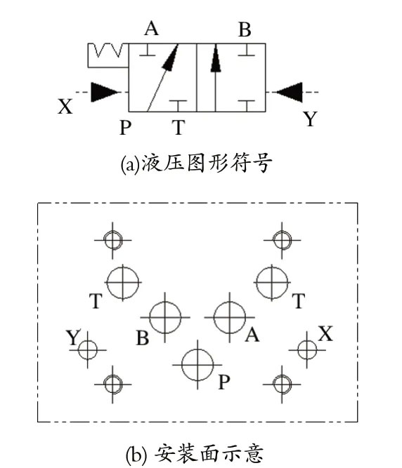 双泵液压站上使用的板式液动换向阀安装在阀组油路块上,通过油路块上设计的油孔及螺钉安装孔进行连接。图2 所示为 23Y 型板式液动换向阀,其安装面上油口众多。当然,进口厂家也有板式液动换向阀可供选择,但是其安装面上同样油口众多。美国PARKER 的 D3DP26D2N 板式液动换向阀如图3 所示,该换向阀在双泵液压站上也有使用。A 口、B 口和 P 口为阀的工作油口,X 口和 Y 口为控制油口。安装面上油口众多,这给阀组油路块的油孔设计增加了难度。此外,板式液动换向阀还存在阀芯容易卡阻、弹簧使用寿命短等问题,这都是制动系统运行中存在的安全隐患。
