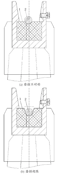天轮装置在返厂修复时,天轮衬垫磨损一般出现2 种情况 (见图 9),衬垫磨损左右不对称和衬垫深度方向磨损超限。分析其原因:衬垫左右磨损不对称是因为天轮装置与主轴装置不对中所致;衬垫磨损严重直接原因是钢丝绳与衬垫发生了相对运动,钢丝绳打滑,轮缘偏摆较大也是原因之一。