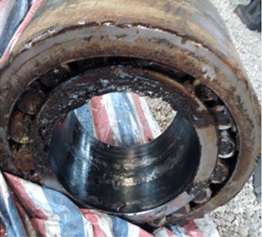 返厂修复的天轮装置轴承座打开后,发现内部多为脂水混合物,轴承内部锈蚀严重,如图8所示。在正确使用、维护及时的情况下,轴承不应出现这种问题,其原因是:轴承座端盖密封年久老化,在露天雨水的冲击下,雨水从失效的密封处进入轴承座内部,使得轴承润滑不良,在重载条件下造成轴承磨损锈蚀。