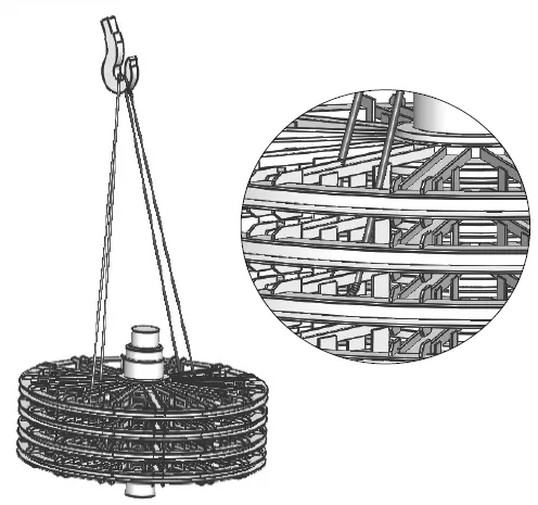 采用两根钢丝绳,主钩钢丝绳从上方腹板中一人孔穿入,绕过主轴,从同一人孔穿出。副钩钢丝绳通过工装吊盘,吊在主轴上方,起辅助调平作用。主轴两端的螺钉孔仅用于把吊具,不能直接把吊环螺钉起吊。