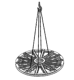 4m以下规格天轮装置:采用两根等长钢丝绳。钢绳兜吊中间两个轮子的轮缘,两根钢丝绳分别挂在同一处槽钢的左、右两侧。为防止轮子变形,两吊挂轮子之间需用千斤顶支垫。