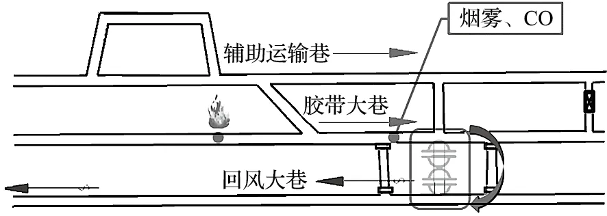 3.3.2 开拓大巷灾变条件下优化方案 当开拓大巷某一地点发生火灾等事故时,由于明火存在火风压,在自然通风条件下,明火与有毒有害气体会随风流向下游区域蔓延。为准确监测灾变后的气体特征,需要安装烟雾和 CO 报警传感器。当监测气样指标超限时,系统自动打开胶回联巷处的 2 道风门,实现局部巷道的风流短路,改变供风方向,切断向下游蔓延的气体扩散通道,从而达到保护下风侧作业人员生命安全的效果。风流短路调控路线如图5所示。