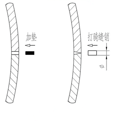 如果缝隙沿筒壳内外不均匀,一般是外侧顶紧,造成贴紧的假象。可以从外侧在接合缝部位打骑缝销并可靠固定,将缝隙处撑紧。