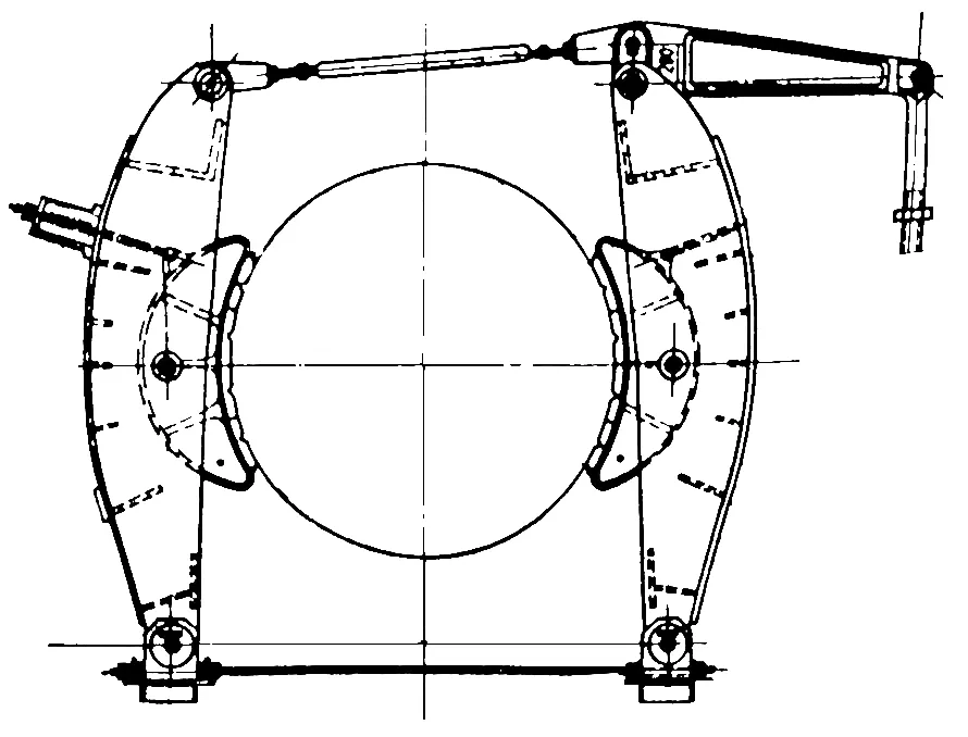 (3)综合闸 早期国产的 JKA 型提升机,旧角移式闸瓦存在磨损不均问题,其制动系统的改造采用综合闸(见图 1),以减少闸瓦磨损,延长闸瓦使用寿命。