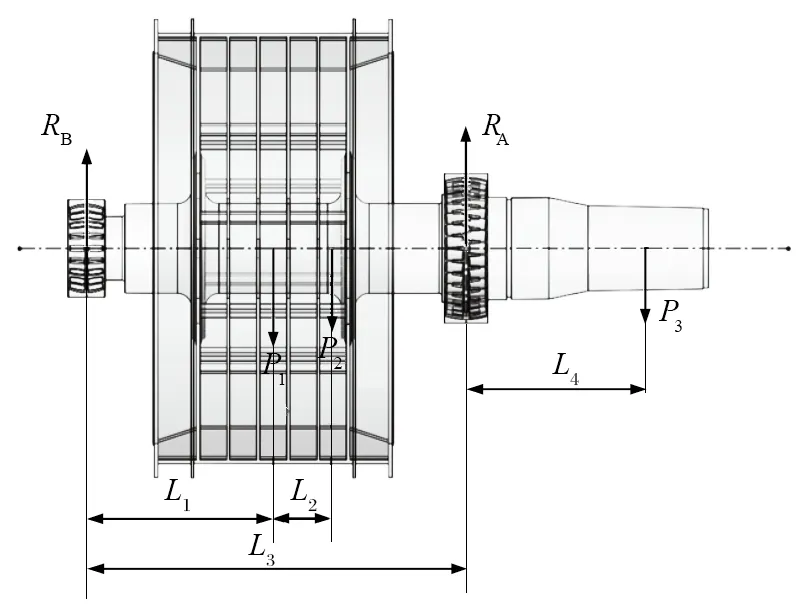 图2 中,P1 为钢丝绳动张力;P2 为主轴重力 +摩擦轮重力;P3 为电动机重力+磁拉力;L1 为非电动机端轴承中 心线到提升机摩擦轮中 心线的距离,L1=1 870 mm;L2 为提升机摩擦轮中 心线到重 心的距离;L3 为非电动机端轴承中 心线到电动机端轴承中 心线的距离,L3=3 800 mm;L4 为电动机端轴承中 心线到电动机中 心线的距离,L4=1 850 mm;RA 为非电动机端 (非传动侧) 轴承承受的支反力,数值与轴承所受径向力相同,方向相反;RB 为电动机端 (传动侧) 轴承承受的支反力,数值与轴承所受径向力相同,方向相反。