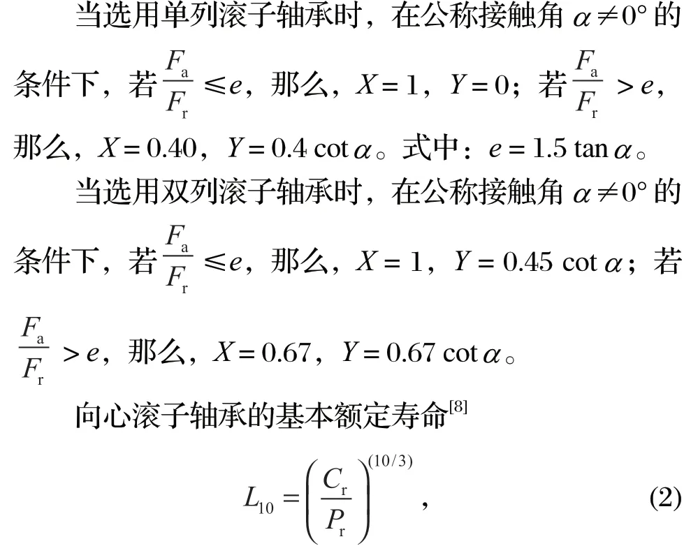 2.2 轴承寿命计算 当公称接触角 α≠0°时,向心滚子轴承在恒定的径向和轴向载荷作用下,其径向当量动载荷