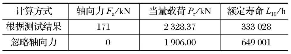 4.3 计算结果与测试结果对比 根据传统方法得到轴向力为 0 kN,测试方法得到轴向力为 171 kN。按照轴承寿命计算公式,利用两方法分别计算,其结果如表2 所列。