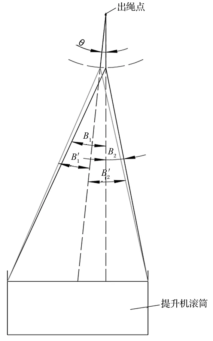 调整天轮和钢丝绳内外偏角的原则,需保证内外偏角值满足《金属非金属矿山安全规程》规定,同时还要确保出绳点位置不改变,即出绳点应维持在罐笼中 心位置的正上方,保证提升容器稳定,如图 2 所示。θ 为 1 号天轮和基座整体旋转的角度,以出绳点为原点顺时针转动;B1 和 B2 为调整之前的内外偏角,图片′为调整之后的内外偏角,2 号天轮和 1号天轮的调整方式一致,仅旋转方向为逆时针方向。
