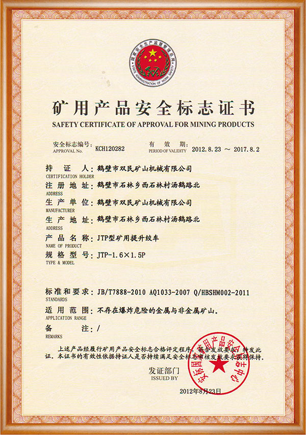 矿用产品安全标志证书